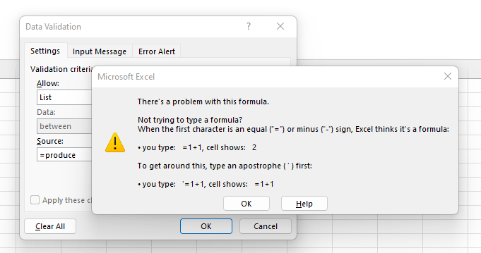 Please try removing the = from before Produce, assuming that Produce is a valid reference within your sheet?