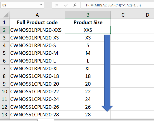 Sorry Jeovany, this just keeps the size in column b - column b i would want to be CWNOS01RPLN20 and not the size?