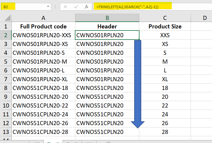 Sorry Jeovany, this just keeps the size in column b - column b i would want to be CWNOS01RPLN20 and not the size?