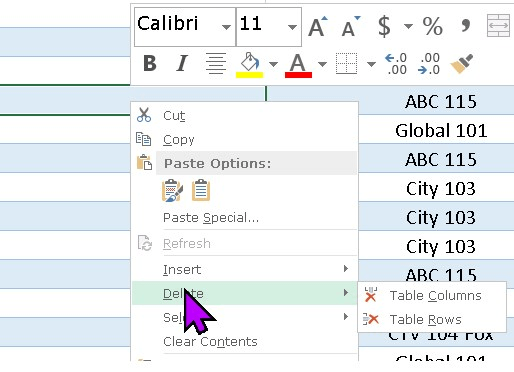 In my spreadsheet there is a table (named "ToDeleteFromDL") for which I cannot delete rows. When I right click on a cell of the table the only options I am presented is to delete the column (which I don't want) or the entire sheet row (which I don't want either).