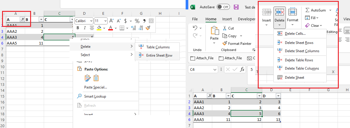When I select the delete option inside an area defined as an Excel Table, I get the following