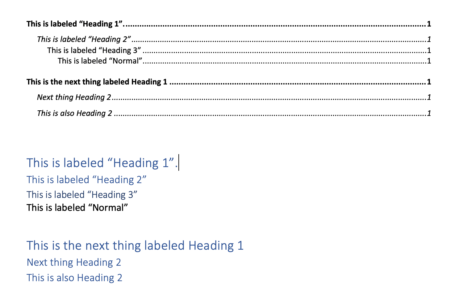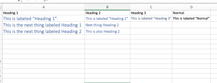 Basically transfer my table of contents into an excel. Where the headers of the columns are the custom headings (in the styles pane) I used to build the ToC.
