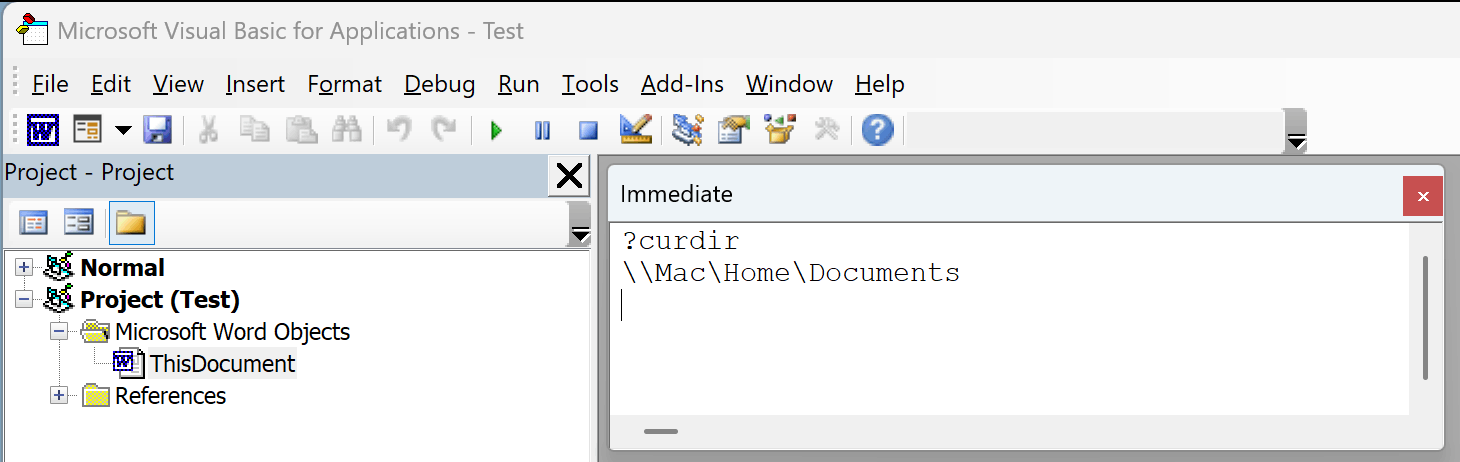Open the target document in Word for Windows in Parallels. In the VBE, in the Immediate Window type: