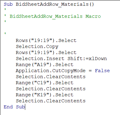 I want the end user to be able to click a green button on the right to insert a fresh row just under the header of the named range. The rows have dropdown selections and formulas so the new row will need all of those functions. The VBA code I have, that works for the "add material" macro is hard coded for a specific row (code below). I need the code to be dynamic because the insert location will adjust based on the ranges above.
