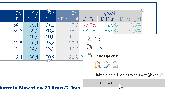 Then if we make changes in the Excel file and go to the presentation, right click the linked table and choose Update link, the table will get the update fine.