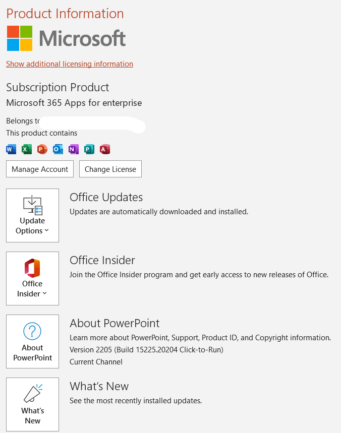 3.What is the version of your PowerPoint? Please go to File>Account, capture screenshot of Product Information, as shown below. We will try to test in same version and check the result.