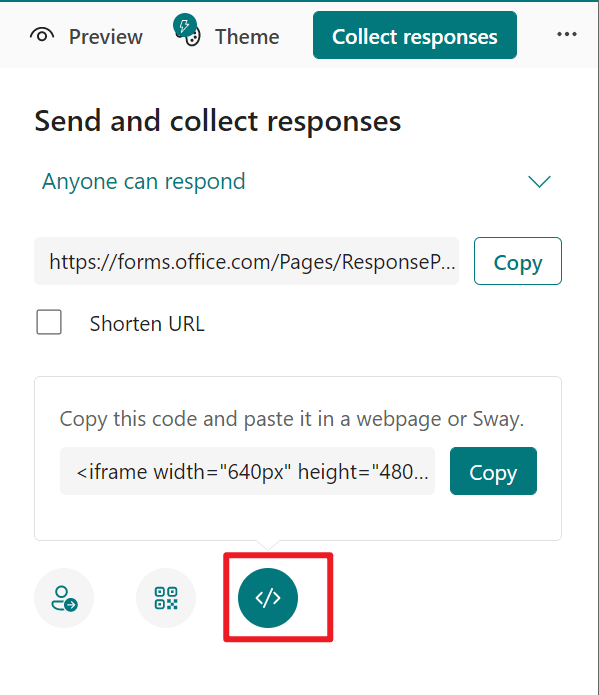 If my understanding is correct, I would like to let you know that the person who created the Form in the Microsoft Forms page will be the default owner of the Form and when the creator click on the Collect Responses can see the Embed icon: