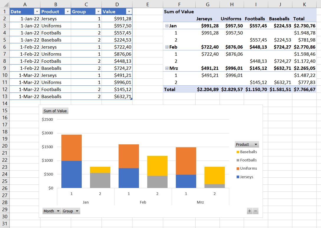 Add a group column to your sales data, create a Pivot table / chart, done.