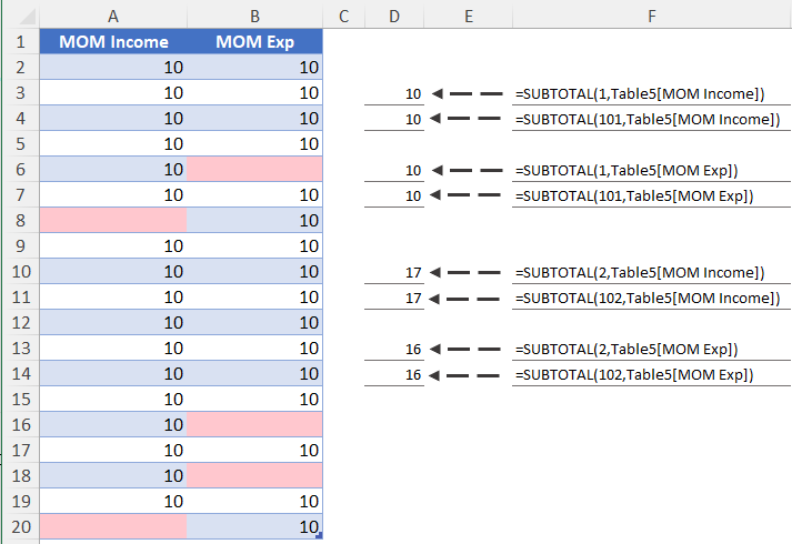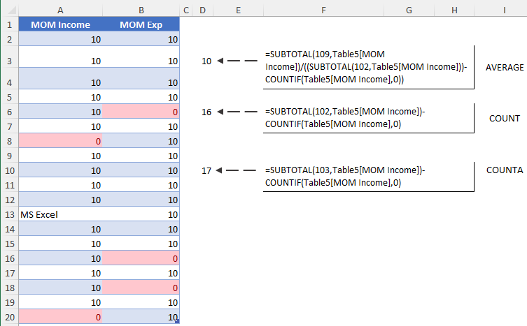 • Formula for COUNT: =SUBTOTAL(102,Table5[MOM Income])-COUNTIF(Table5[MOM Income],0)