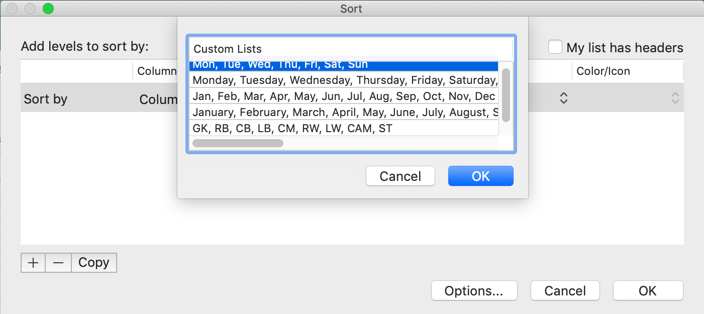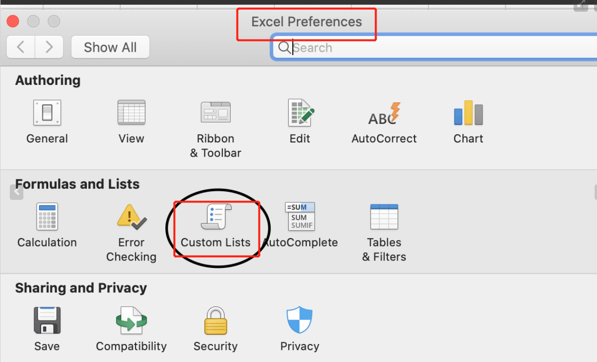 - On the Excel menu, click Preferences, and then under Formulas and Lists, click Custom Lists .