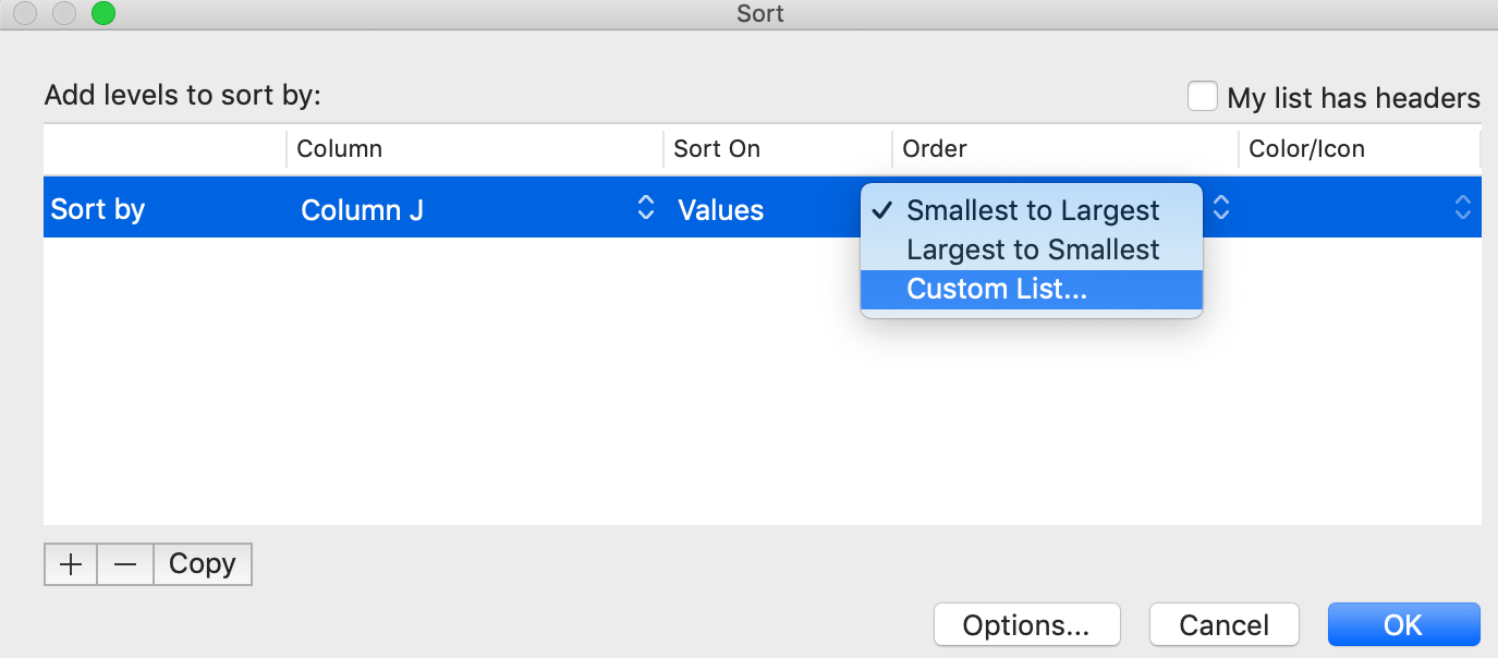 Custom Sort Order in Excel 2016