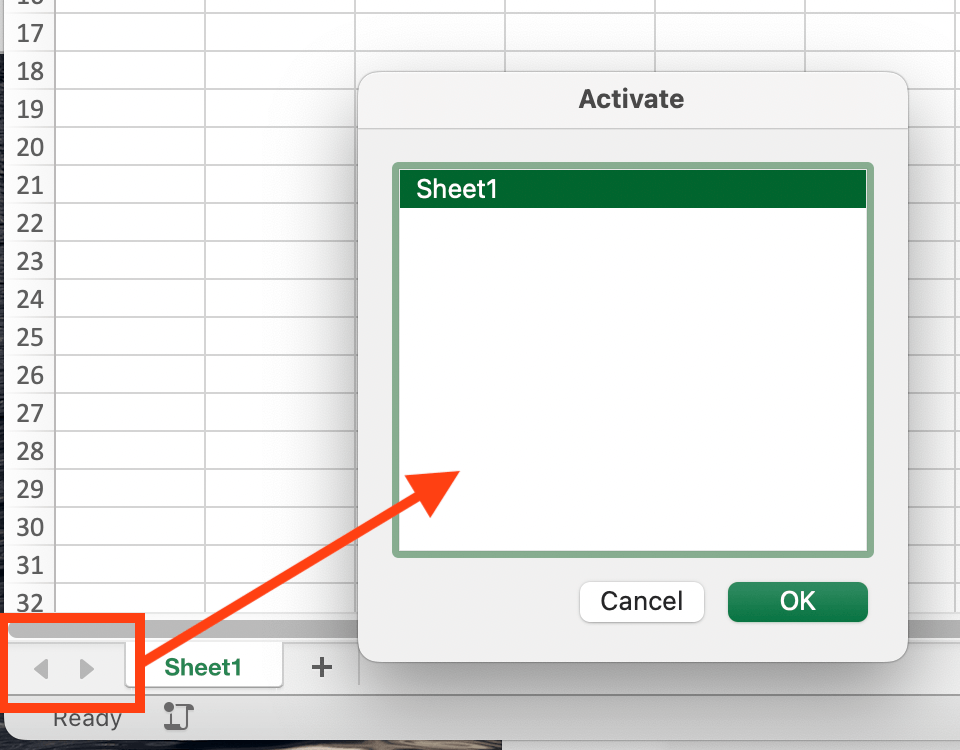 Right click at the bottom of the Excel can display a list of all tabs. How do I do that on Mac?