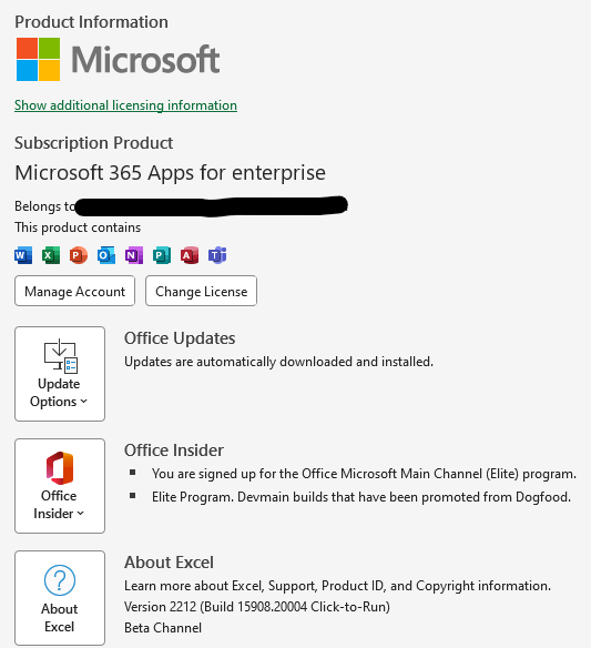 1.What version of Office are you using? Could you attach a screenshot of the Files>Account page like below: