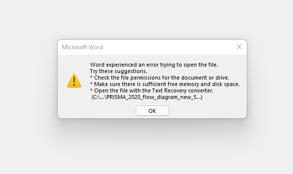 The PRISMA flow chart downloads as a MS Word, but when I try to open it I get an error message: Why am I unable to open this MS word file. I used to be able to open it and recently I have been having this issue. I have Office 365 I downloaded from my University. Please help.