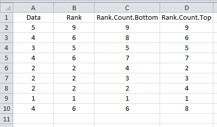 =RANK($A1,$A$1:$A$9,1)+COUNTIF($A$1:$A1,$A1)-1