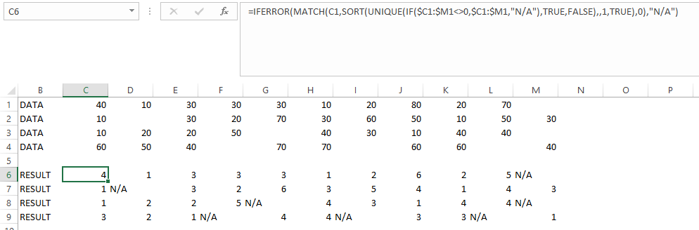 =IF(C1="","N/A",SUMPRODUCT(($C1:$M1<=C1)*($C1:$M1<>"")/COUNTIF($C1:$M1,$C1:$M1&"")))