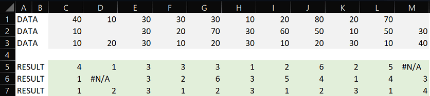 =IF(C1="","N/A",SUMPRODUCT(($C1:$M1<=C1)*($C1:$M1<>"")/COUNTIF($C1:$M1,$C1:$M1&"")))