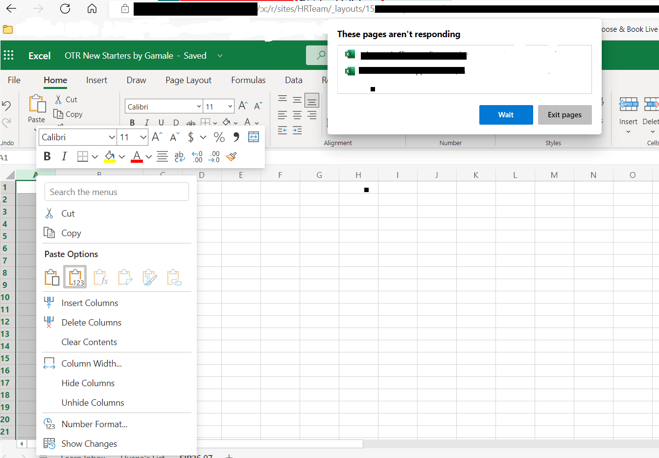 Based on the description, when pasting a contents from Excel local copy into SharePoint Online Excel file xls, it keep freezing or not responding. I just want to confirm your Excel file format is xls saved in SharePoint Online library and you open it on Excel Online?
