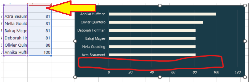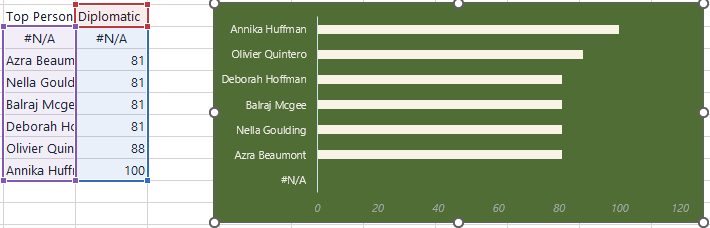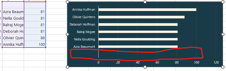 In the example, I filter 5 top people in pivot table, but preparing 7 rows (in case there are same scores). The data shows 6 people in top 5 filtering. How do I automatically change the chart to show 6 people (removing N/A)
