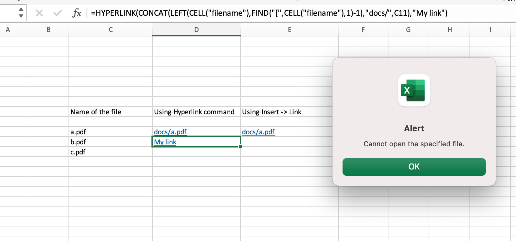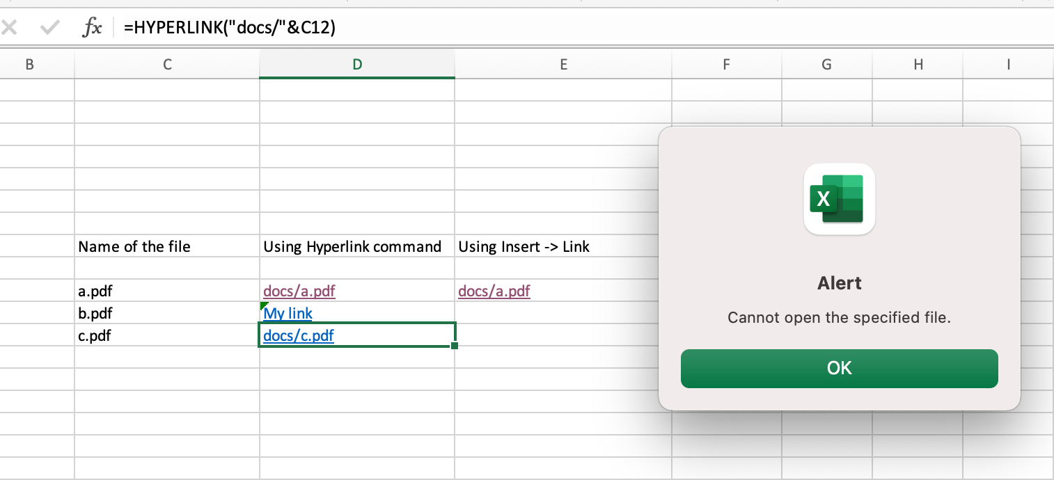 In the row with a.pdf, I have created two links to the same file - one. using the HYPERLINK command in column D (D10) and another using "Insert->Link" in column E (E10). When I click on D10, it gives me this error. Then, if I click on E10, the file opens. When I close this file and click again on D10, the file opens properly without any change.