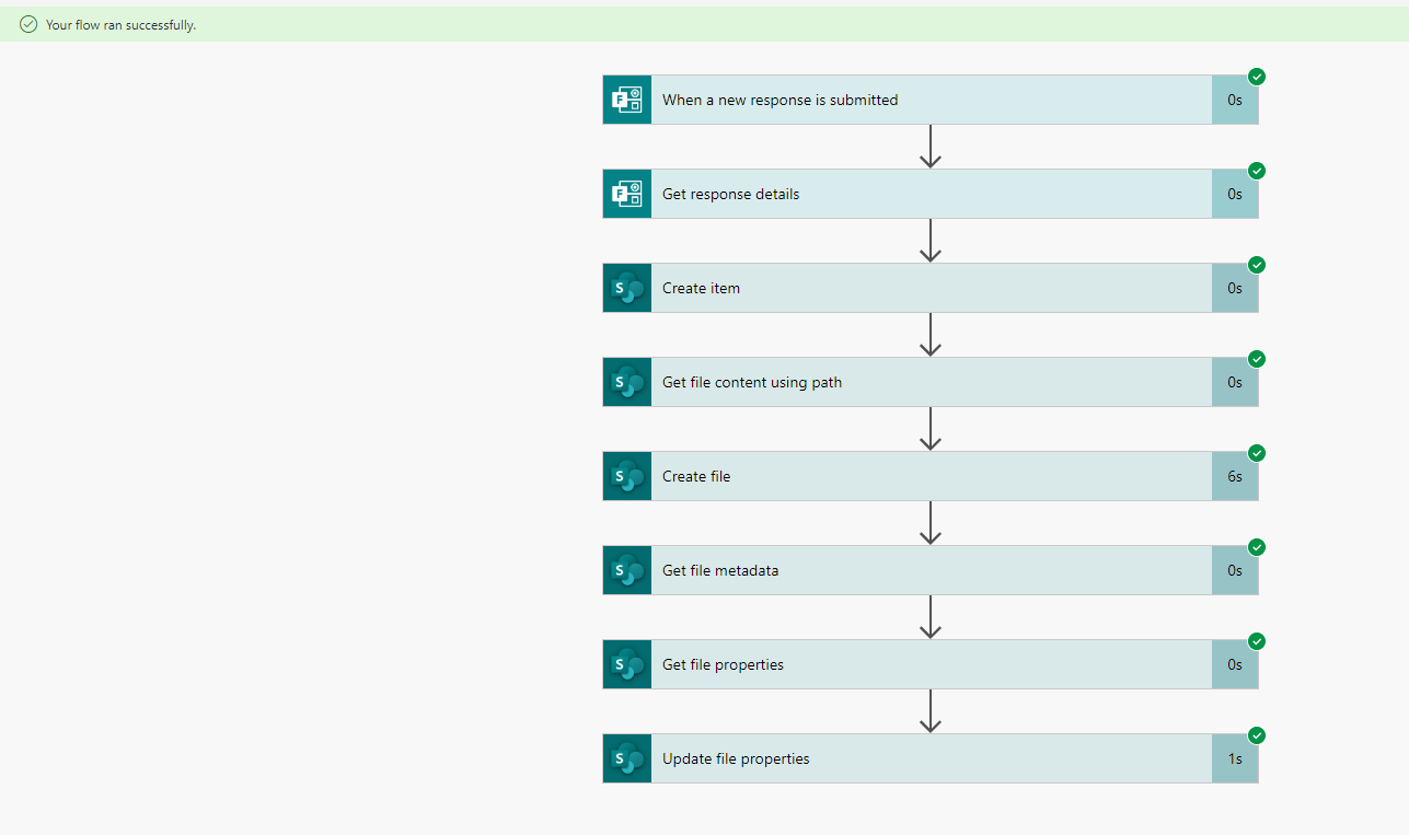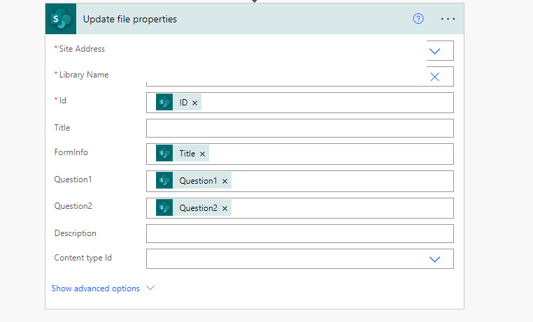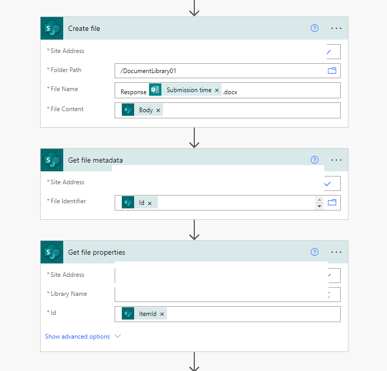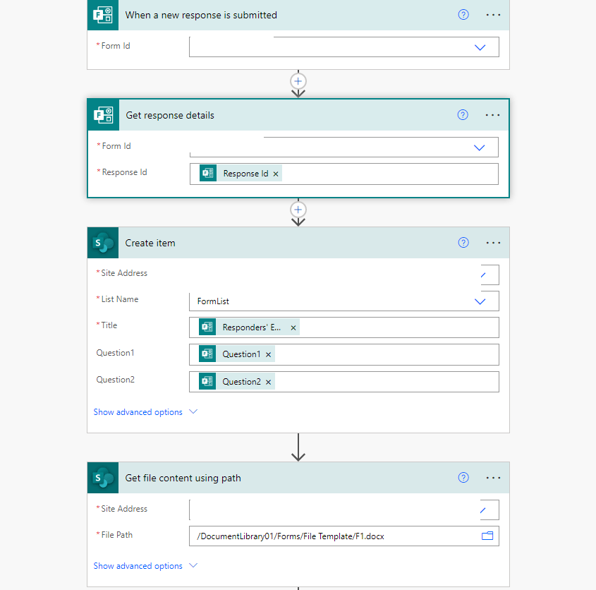 As a workaround, you may create a content type in the document library as a template of the file creation, create a list to record the form information, insert the library property with the Quick Parts option into the content type and finally update the file property with the list field values and map the file property values to the template content. All the process can be completed by the flow as follows.