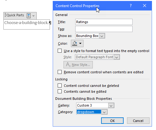- In the Properties dialog, enter a title such as "Ratings". At the bottom of the dialog, set the Gallery dropdown to the name of the Custom gallery you used for the building blocks, and set the Category to "dropdown" or whatever you chose before. Click OK.