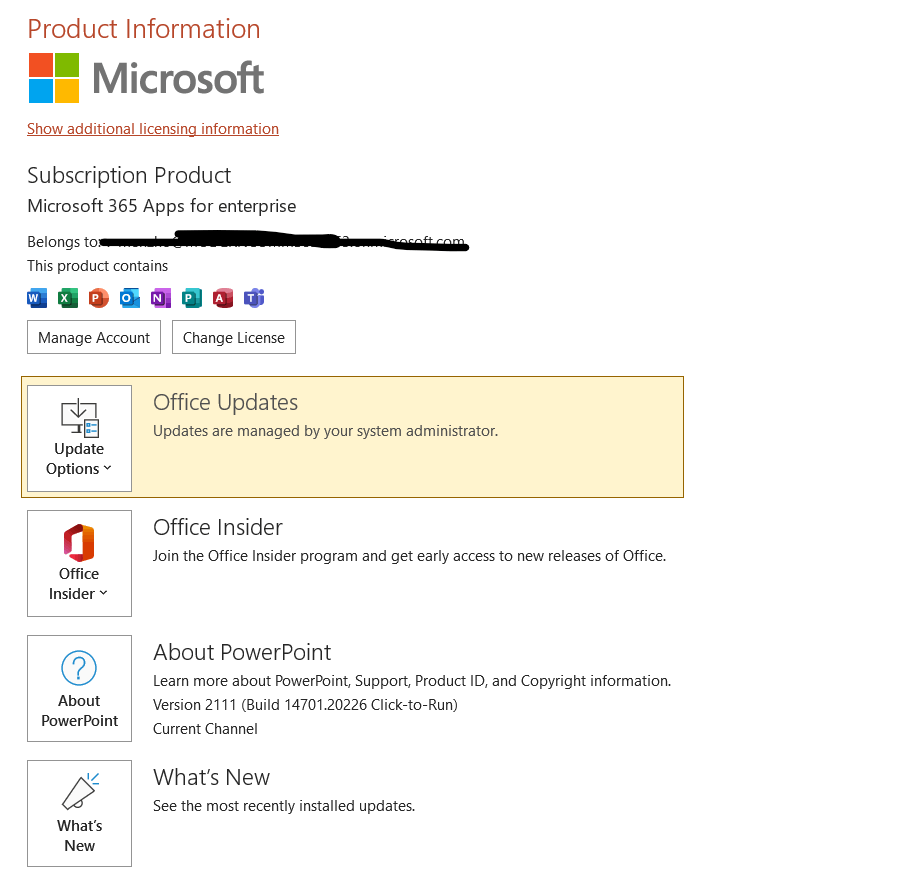 - Would you please share the version of your office by going to PowerPoint > Account and share the screenshot as shown below with us?