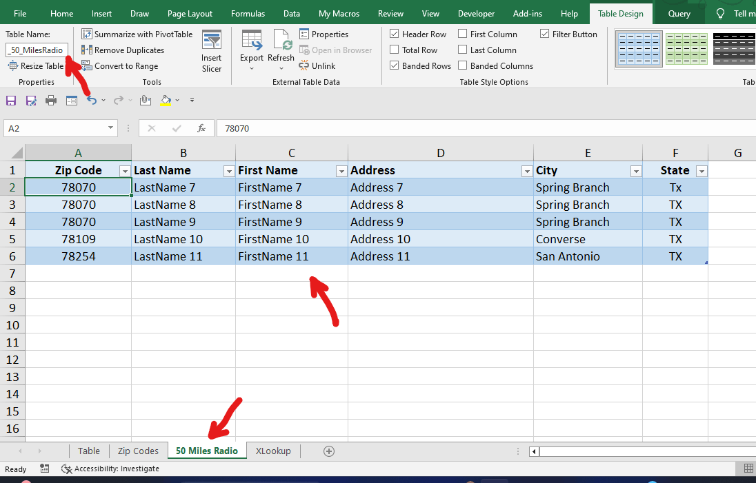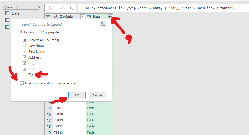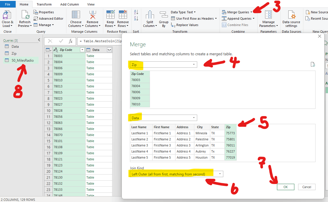 4 and 5) Choose the 2 tables as indicated in the picture and select the columns to Match in this case the "Zip" column