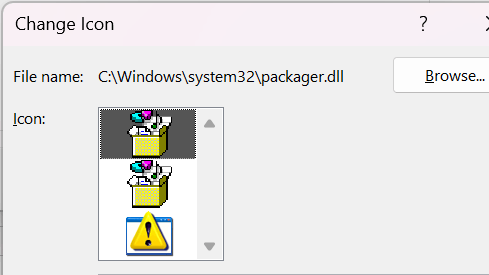 If I don't select "change Icon" at all the object inserted into the excel sheet has no icon at all.