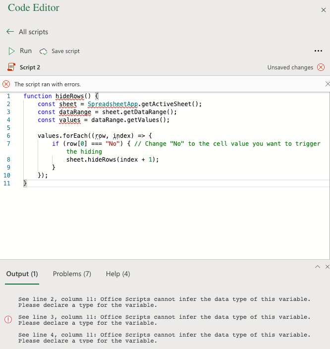 Sub HideRows() Dim i As Integer For i = 1 To ActiveSheet.UsedRange.Rows.Count If Range("A" & i). Value = "No" Then Rows(i). Hidden = True End If Next i End Sub