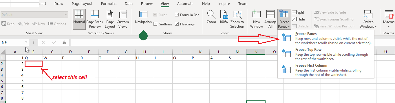 - Go to the Viewtab and click on Freeze Panes, select Freeze Panes, as show below.