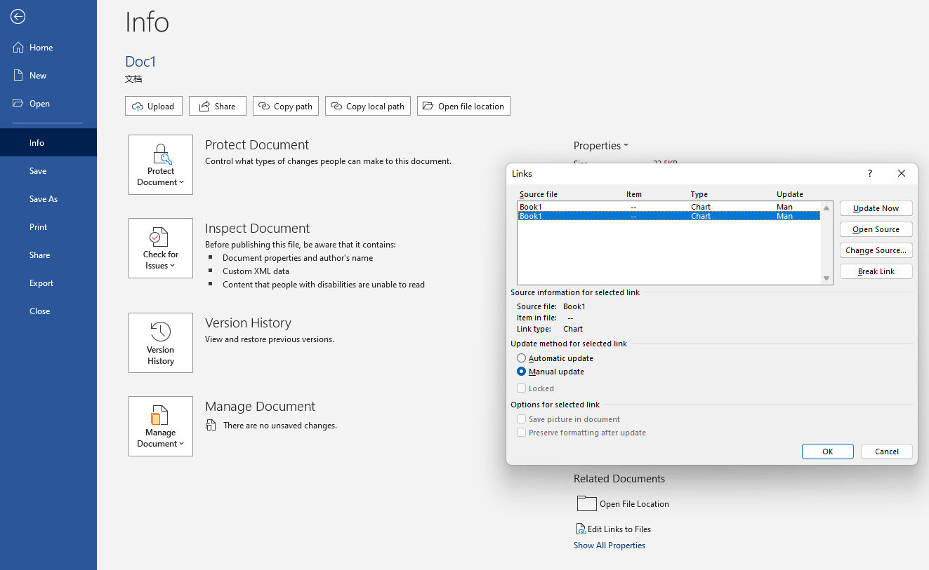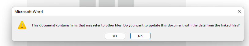 Word asking whether to update the data depends on the following Settings: File- Info-Edit Links to File