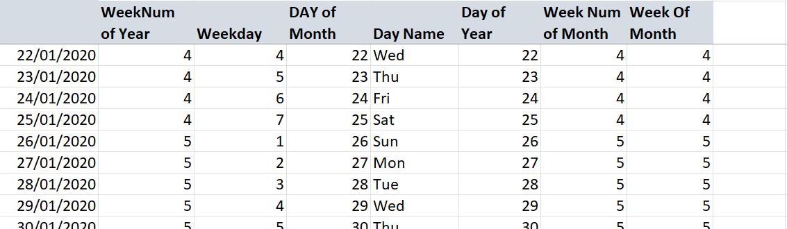 Week 1 starts on the 1st day of the month, week 2 on the 8th, week 3 on the 15th, etc.