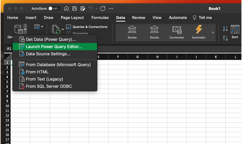 Per your description, the button Launch Power Query Editor is missing in Excel for Mac.