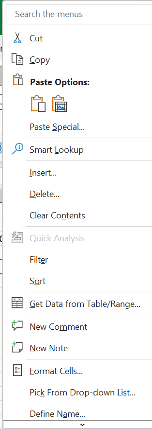 5. Exit back to Excel by pressing Alt+Q, and verify that the Comment and Note options have been restored.