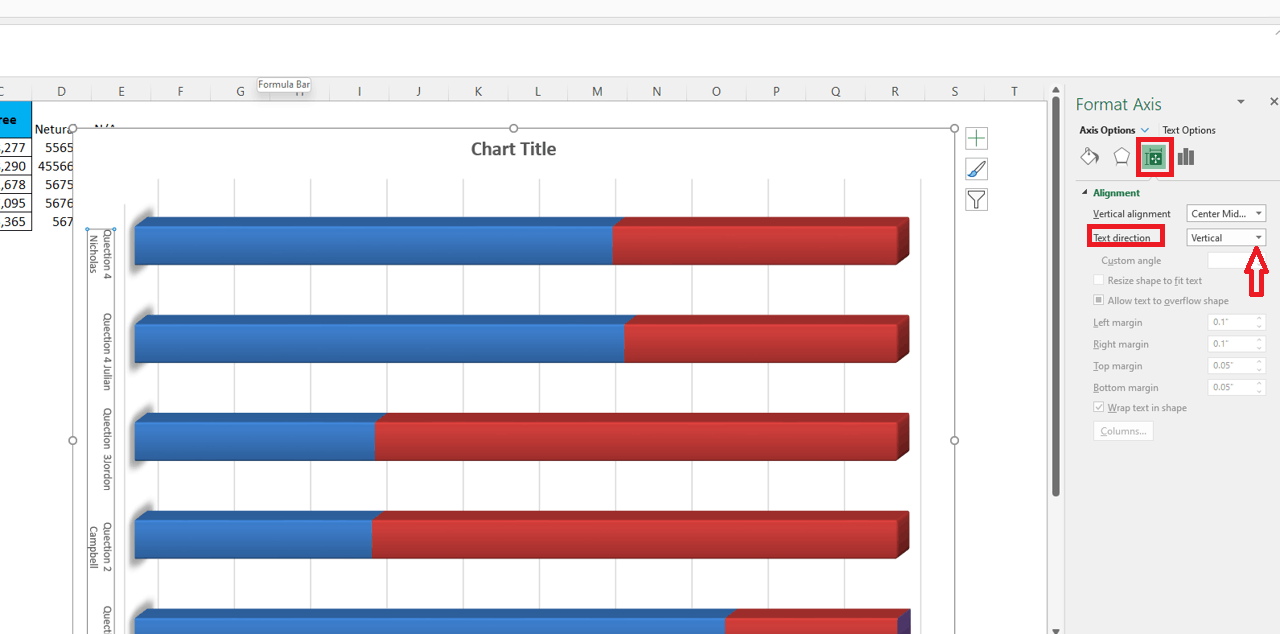 As per your description, can I know does in your data sheet the Text (Question 1, question 2 and Brian and Kate) are in separate column cell? If yes, then you need to first combine text into one column cell or putt Text in one column then create a bar chart and change the text direction of the vertical axis of bar chart in a "Format Axis" in the dialog box, as like shown in below screenshot: