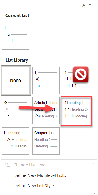 If you are going to use the built-in list styles, start with the ones that say Heading 1, Heading 2, etc. Do any modification to Indents or the appearance of the numbering in the Define New MultiLevel List Dialog