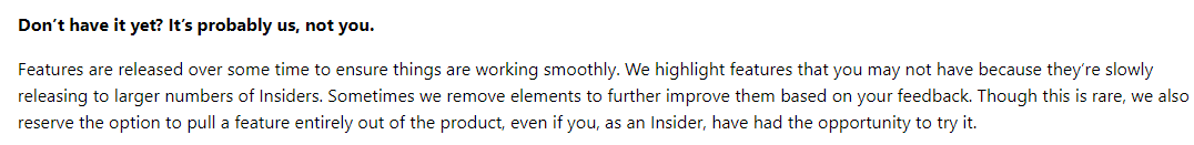 This feature could be changed/removed or even not released to all insider users by the product team, we apologize for the inconvenience caused by this scenario.