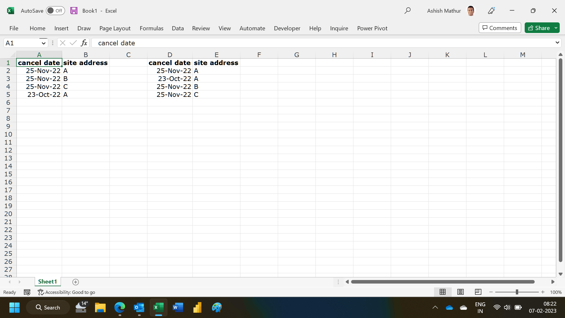 What I want to have happen is for the sort of this entire table to be primarily by cancel date, as shown, and then if there exists another site address that matches a more recent cancel date site address for that to be right under the latest one, like this...