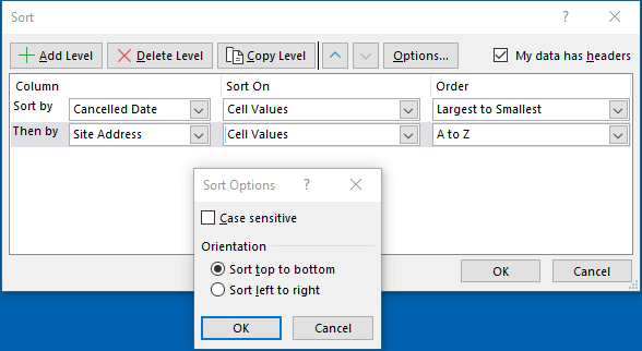 I have an Excel file that has lots of rows with some rows largely repeats of other rows. I have a high-priority column I sort the file on, let's call it "job cancel date," and then I have another column of interest, say "site address." I want to be able to sort the file on "job cancel date" primarily, with most recent (ie, largest) first, and then if there are other rows later on in the file that have the same "site address" as a row with a larger "job cancel date" I want those rows to be located immediately under the first row having that "site address" with the larger "job cancel date," with those later rows (having the same "site address") arranged by "job cancel date" under the first row having that "site address." How can I do that?