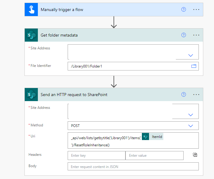 Uri: _api/web/lists/getbytitle('Library001')/items('outputs('Get_folder_metadata')?['body/ItemId']')/ResetRoleInheritance()