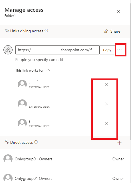 - Remove all unique permission levels from the folder by clicking on the folder>Manage access>Advanced>click on Delete unique permissions and try whether all external users including the affected user can be removed from the folder. If yes, share the folder with the other external users you don't want to remove again to see if it works in your environment.