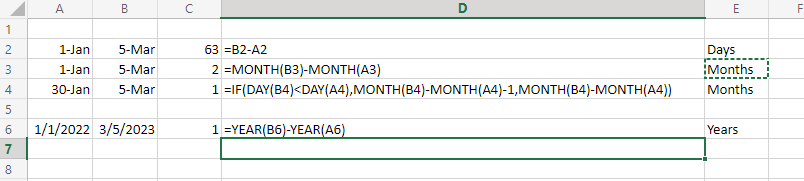 PS.... MSFT has been trying to deprecate the use of DATEDIF for many years. In Excel 2010, for example, it does not appear in offline help, and there is also no meaningful intellisense for the function. Nevertheless, the function persists. Click here for the online help page.