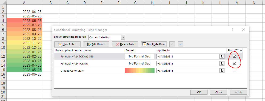 I ONLY want the Conditional Formatting/3 Color Scale to apply to dates that are within the last year/365 days of today. I plan to do something else with dates that are beyond a year old. However, the formula keeps applying to the entire column, regardless of the date. Does anyone have a solution or alteration that will work for this problem?