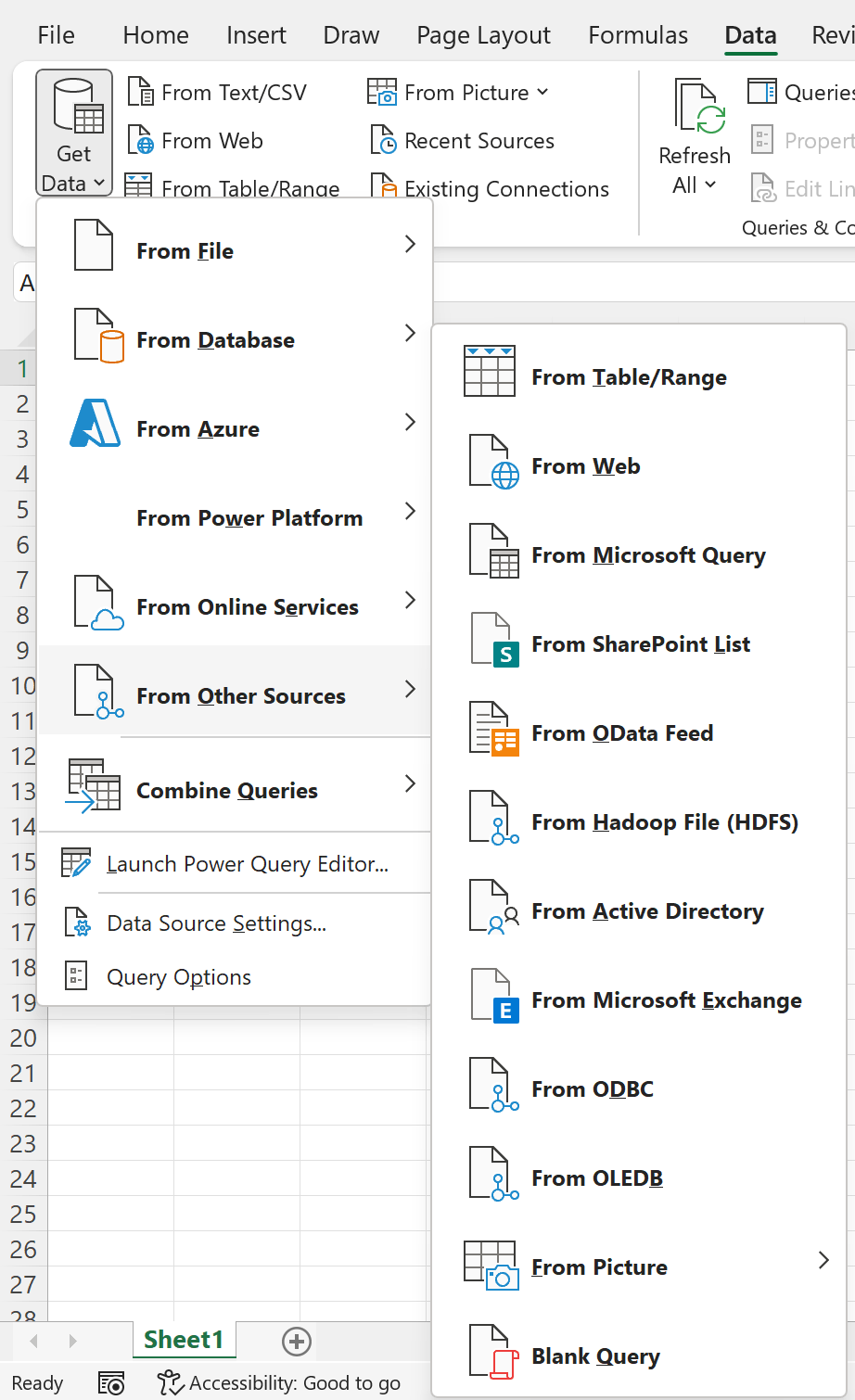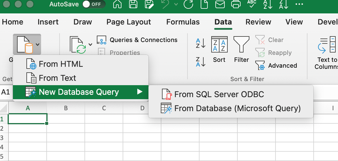 In order to help you figure out how to get your data in Excel for Mac, you'll have to tell us what kind of data source file you want to get data from. Is it CSV, Excel Workbook, Microsoft Access, SQL Server or any of the kinds shown above?