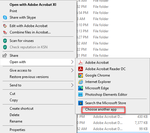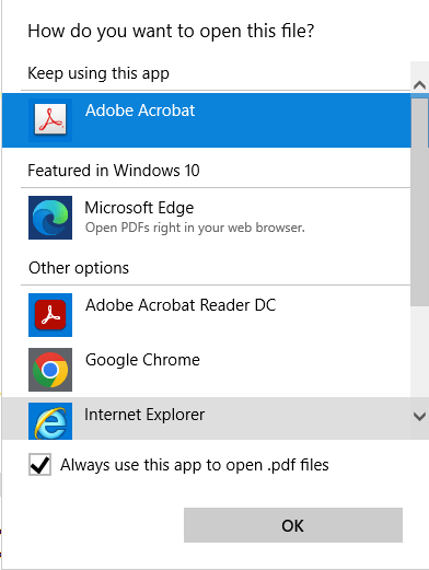 Choose the appropriate program, check the box for "Always use this app to open .pdf files," and click OK.