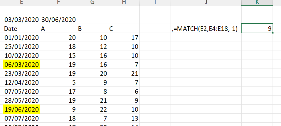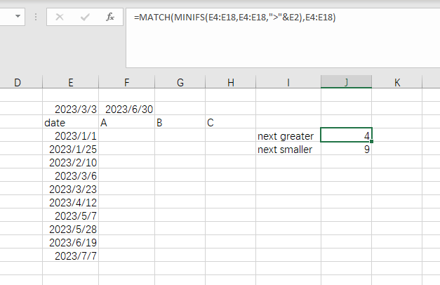 MATCH(H3,SORT(E4:E9,,-1),1) sort descending and then look for lesser that even though you want greater, but this failed when tried with the dates, any ideas