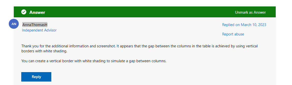 Thank you for the additional information and screenshot. It appears that the gap between the columns in the table is achieved by using vertical borders with white shading.