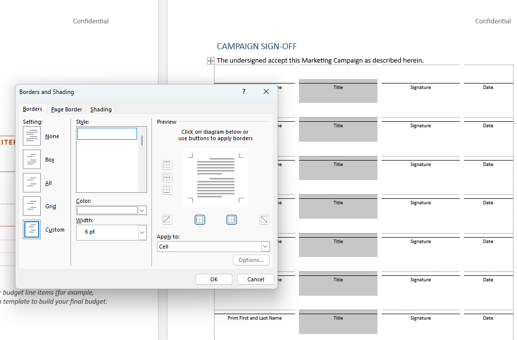 There is a template in Microsoft Word called "tactical business marketing plan". On the last page of the template, there is a table. I would appreciate it if anyone can please explain how the gap is created between the columns. Thanks!