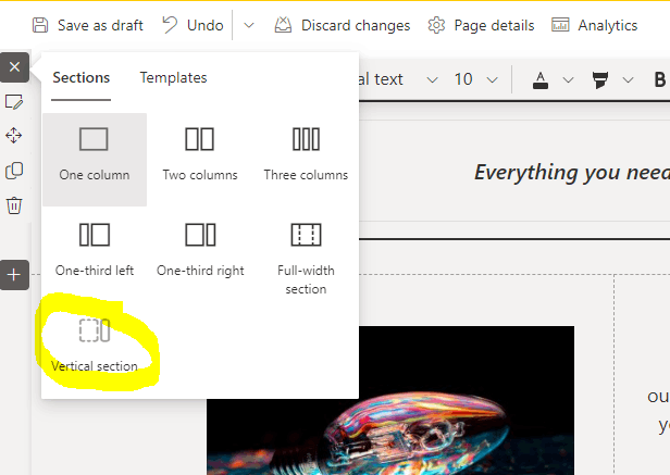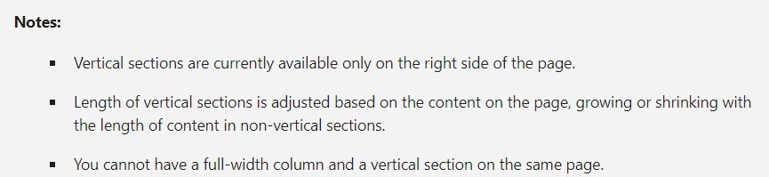 If the understanding above is right, as per the search and test on our side, generally, Vertical sections are currently available only on the right side of the page, and we cannot have a full-width column and a vertical section on the same page.